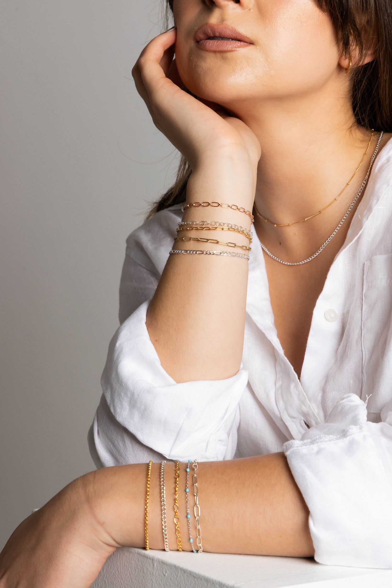 Your style, your rules. Choose from an exquisite selection of chains and metals, including sterling silver, 14k gold-filled, and 14k rose gold. Whether you’re looking to build a stunning stack of bracelets, anklets, or necklaces, our permanent jewellery is personalised to fit you perfectly. Create a look that’s as unique as you are, tailored to elevate your everyday elegance.